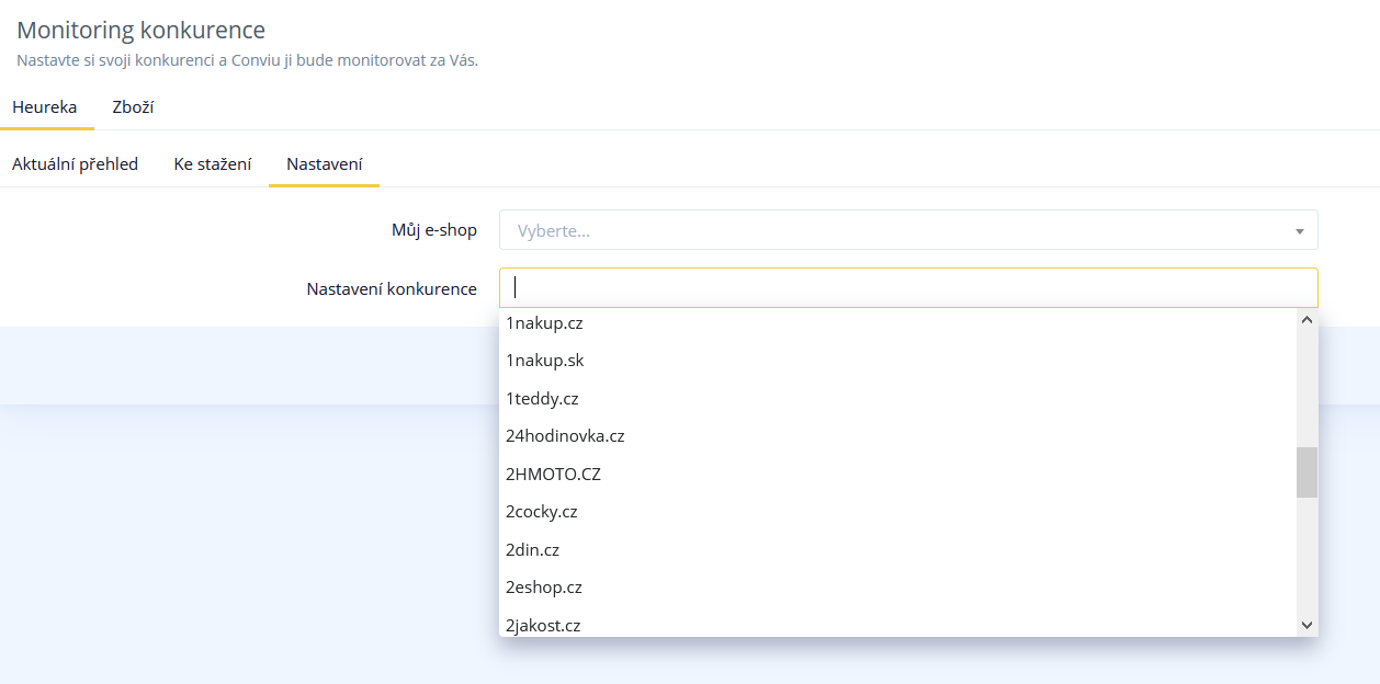 Konkurenční eshop vyberete z nabídky všech eshopů. Kolik zvolíte eshopů, záleží na Vás. Doporučujeme top 5 konkurentů.